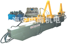 拉彎?rùn)C(jī)結(jié)構(gòu)革新特指一種拉彎?rùn)C(jī)結(jié)構(gòu)改良。拉彎?rùn)C(jī)的結(jié)構(gòu)改良包括有機(jī)架、轉(zhuǎn)臂,機(jī)架上側(cè)結(jié)合有一大盤,而機(jī)架前端兩側(cè)對(duì)稱樞接兩轉(zhuǎn)臂,轉(zhuǎn)臂上軌面安裝有附帶夾頭的活缸座,驅(qū)動(dòng)轉(zhuǎn)臂的拉彎油缸的一端鉸接于機(jī)架靠前段,另一端由活塞桿之外端鉸接于轉(zhuǎn)臂的內(nèi)側(cè)凸緣上,該凸緣位于轉(zhuǎn)臂的靠外段上,所述機(jī)架、轉(zhuǎn)臂及拉彎油缸之間為活動(dòng)三角關(guān)系。拉彎?rùn)C(jī)的拉彎油缸無(wú)須穿過(guò)轉(zhuǎn)臂內(nèi)中部,由此轉(zhuǎn)臂也就無(wú)須在內(nèi)中部鏤空,確保拉彎?rùn)C(jī)轉(zhuǎn)臂的一體性,加強(qiáng)了拉彎?rùn)C(jī)轉(zhuǎn)臂的強(qiáng)度和剛性。